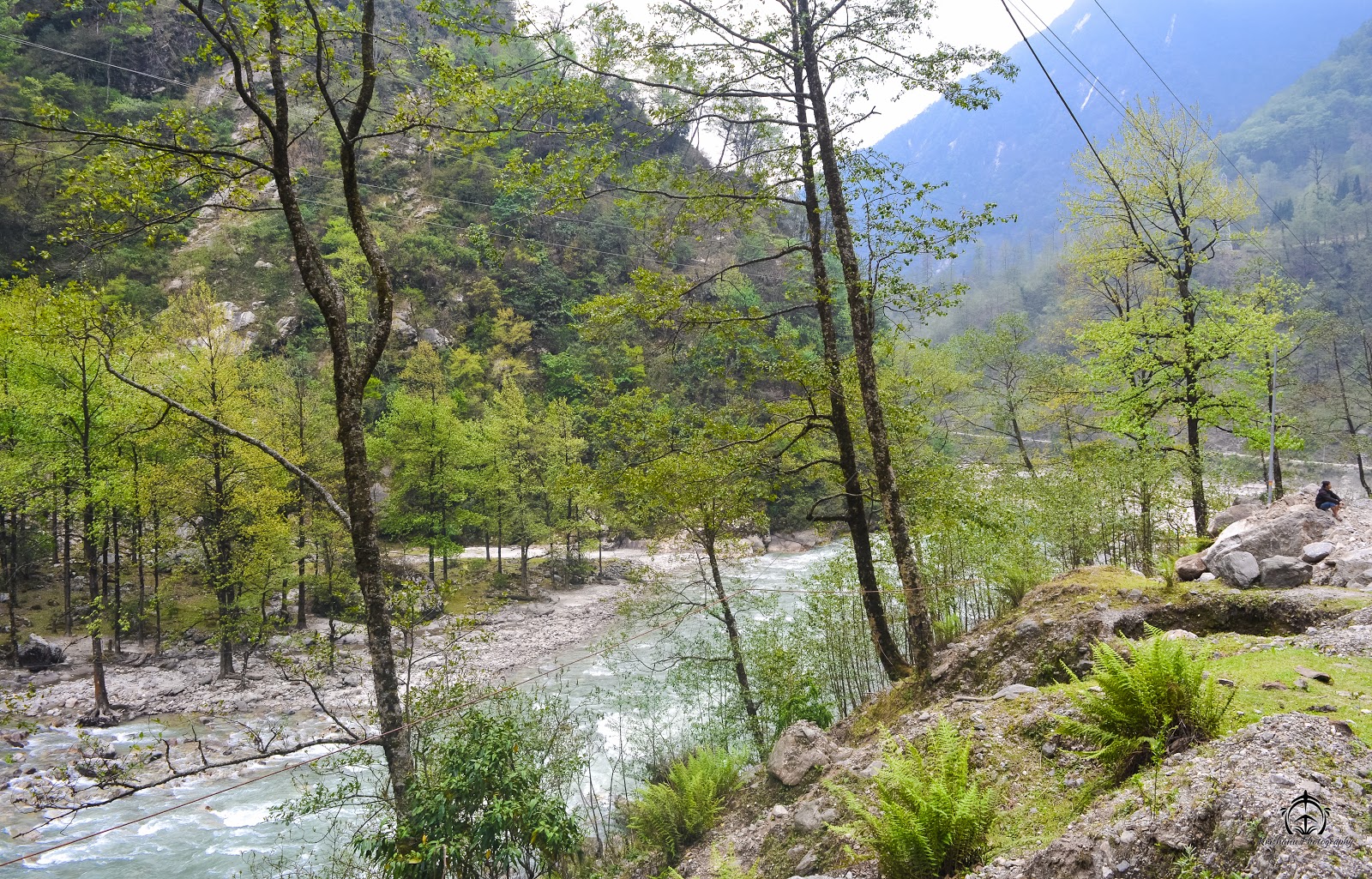 নদী, পরে এটি তিস্তার সাথে মিশেছে। পেছনের ক্যানভাস জুড়ে রয়েছে আদিম অথচ চিরনতুন শ্বেতশুভ্র "কাংচেনজাই" গিরিশৃঙ্গ। অতি বড় নাস্তিক ও এখানে মাথানত করবে।।